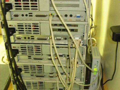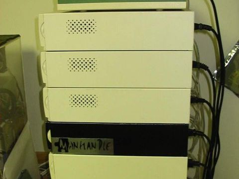 this is my personal computing cluster, running Debian GNU/Linux, OpenMosix and a custom 2.4 linux kernel. most hardware in these photo's is focused on the deskpro stack of pc's sporting 80gig drives, 512mb memory, and SMALL 90W power supplys! These machines were designed to go the long haul, and besides a few WOL issues, have few bugs and a ton of features.