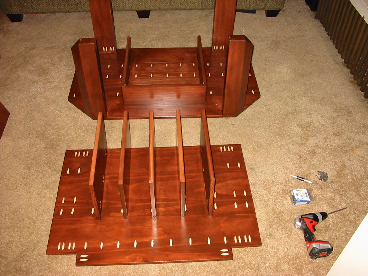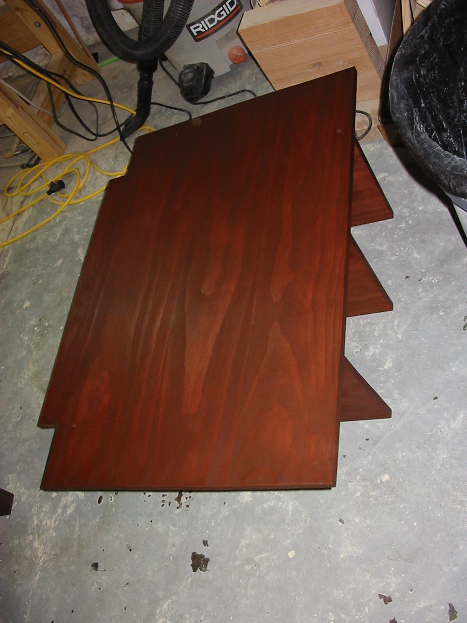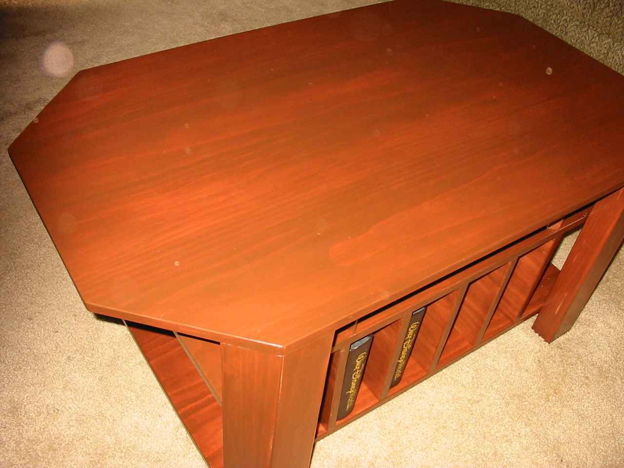 The 45 Collection - Coffee Table this is the second piece from my original furniture collection, entitled 'The 45 Collection' this fine woodworking project was executed to perfection, from sketch to sticks to finishing this piece really came together fast! the design is intended consume a lot of space, providing a large useable surface, and maximum storage and display features. of course some might argue, "fine woodworking?" but pocket holes can join wood in the time you can imagine a challenge. i may soon reach the ceiling of pockethole design, but i will wip up a bunch of Good Stuff getting there! of special note is the Ultra tough waterbased finish, it has stood to more than i would have ever thought: ball point pens and pencils on sigle sheets of paper is NO PROBLEM, hot pans, dog claws, and cats can do their worst! wet, sand, prestain, sand, prestain, sand, stain, sand, stain, sand, poly, sand, poly, steelwool, poly, steelwool, tack. Woa, glad thats over!