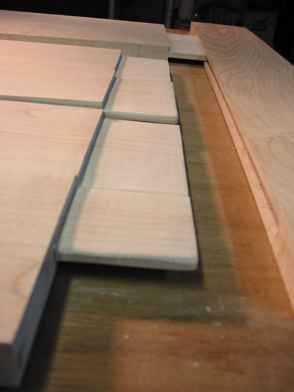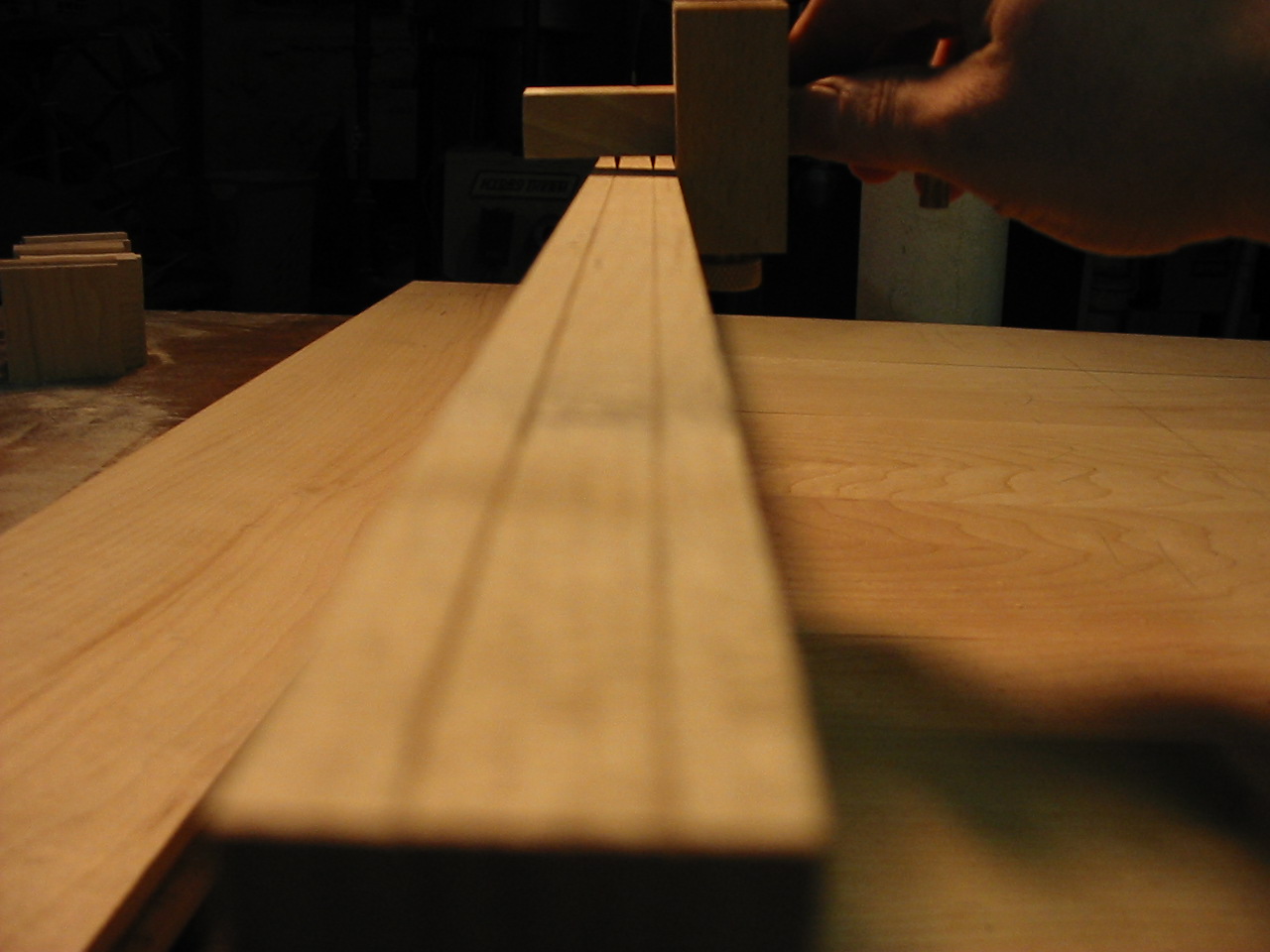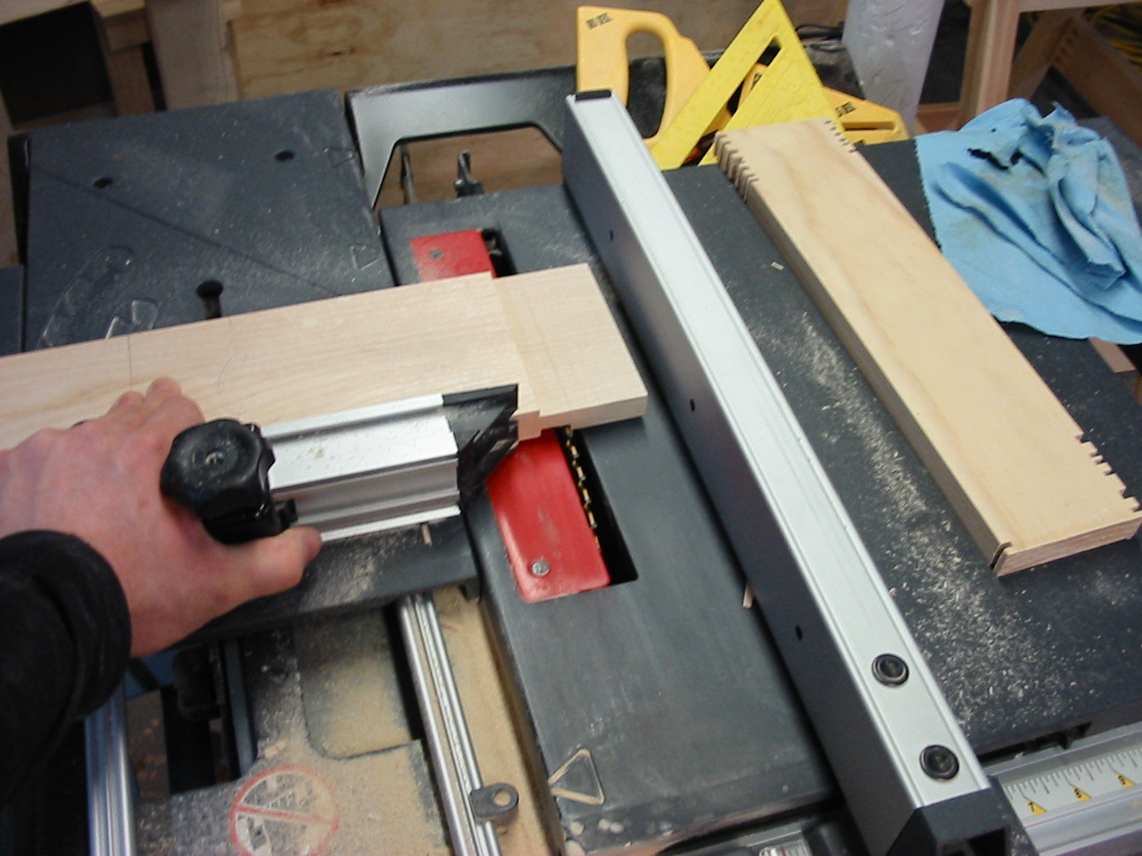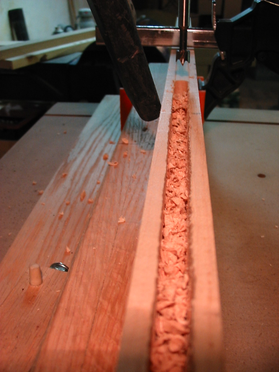 My FW 2008 One Board Furniture Build-off Part2 Well the cat is out of the bag! I am building a "Pub Table" from my hard maple stick! It is a type of 'occasional table' but mostly its a high-top table we plan to use in our kitchen! The first new joinery technique i am using is a breadboarding, and in this part i cut the table top and create the breadboard ends! It was fairly straightforward, and i began by making the cheek cuts on my table saw, then nibbling away the rest of the tenon. and finally using my files to clean up each tenon. The breadboard itself was bored out using my fancy new drill press! I hooked up a shop-vac to suck out the debris, but because the chips were so course they really got embedded in the slot. It took a lot of work to clean out the slot, and cleaning up the ridges with a file and chisel was actually easier! Finally i returned once again to my trusty file, this time to make sure at least one end of the top fit snuggly into the breadboard, the other will be cleaned up once the top is all glued together. The excess breadboard end will disappear! The next installment will be uploaded soon, it includes another new joinery technique which i have not used, and my first attempt working with hide glue! There were some problems! Hang in there....