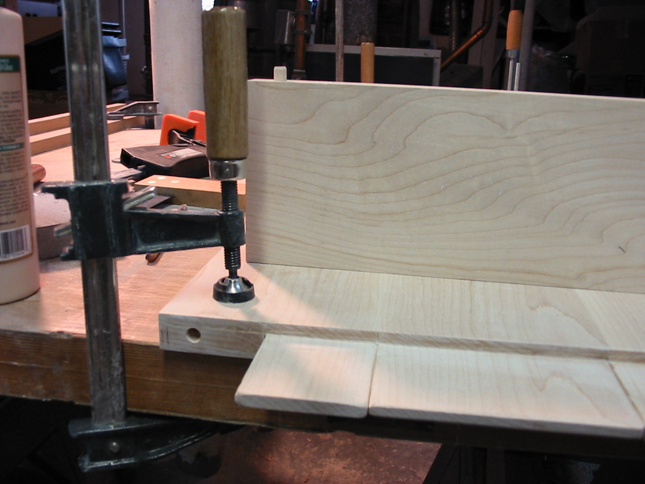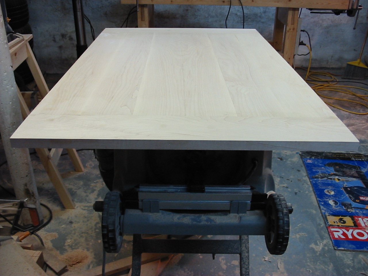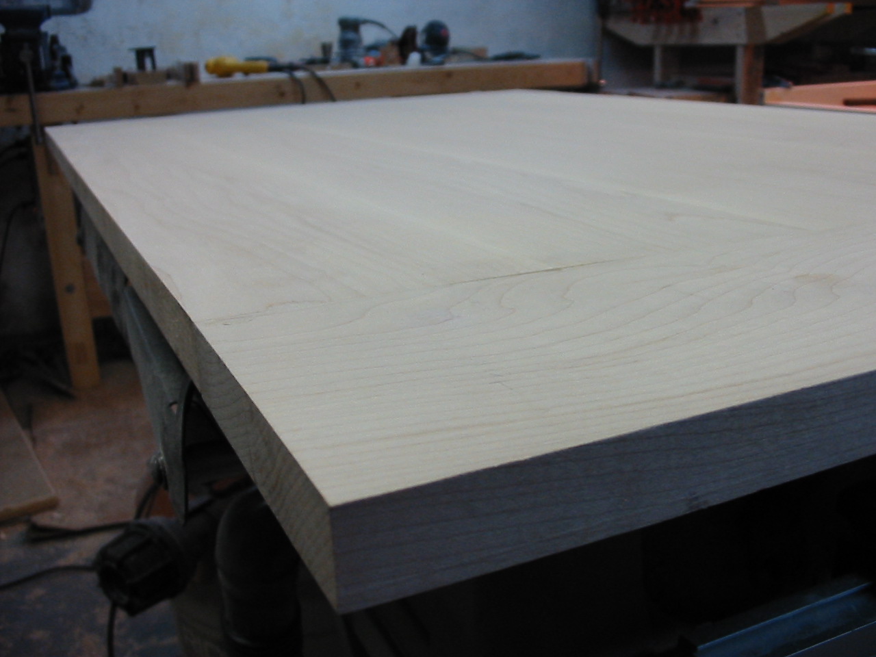 Getting the very ends of the breadboard to line up with the top section was accomplished with a couple home made dowels, made from the very same maple, and were actually the cutoffs from those sections!
