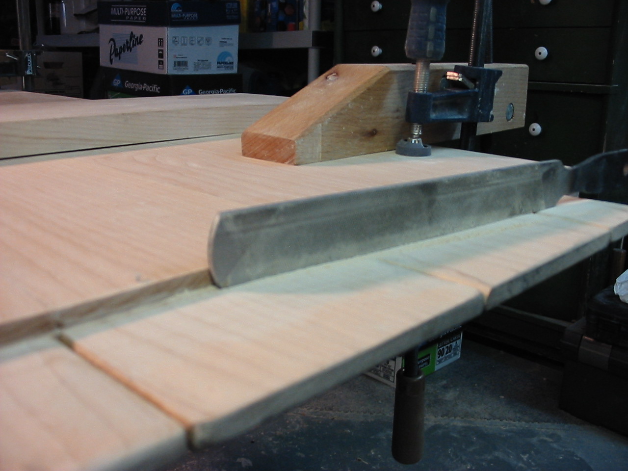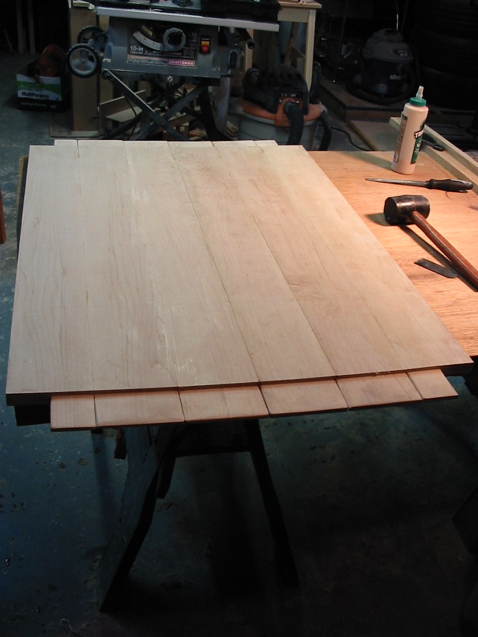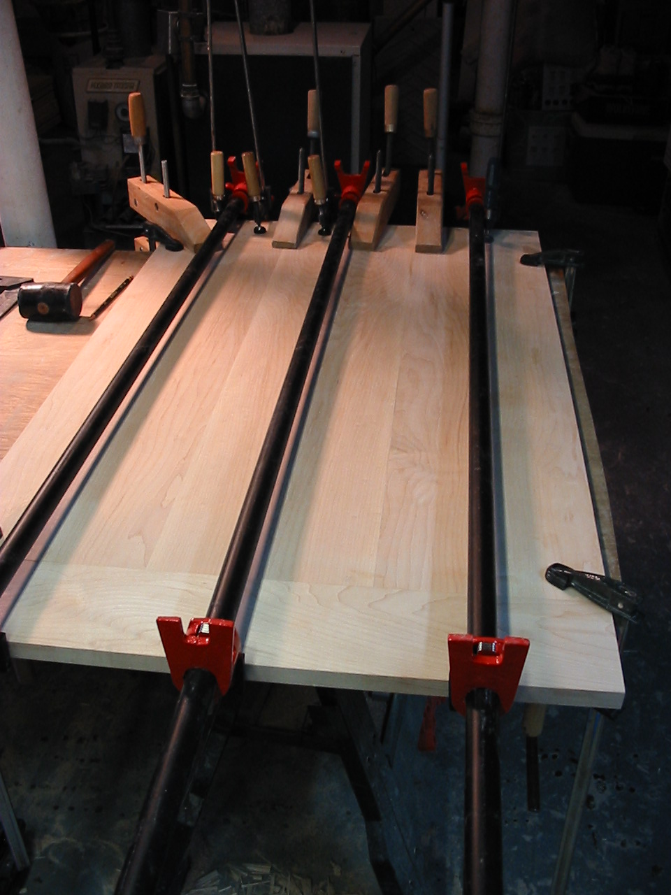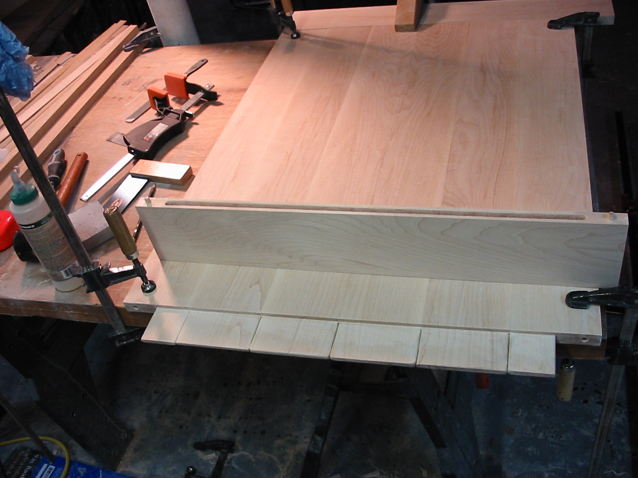 Getting the very ends of the breadboard to line up with the top section was accomplished with a couple home made dowels, made from the very same maple, and were actually the cutoffs from those sections!