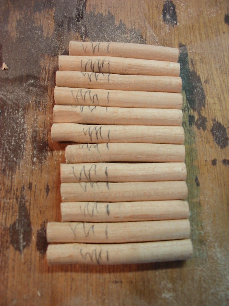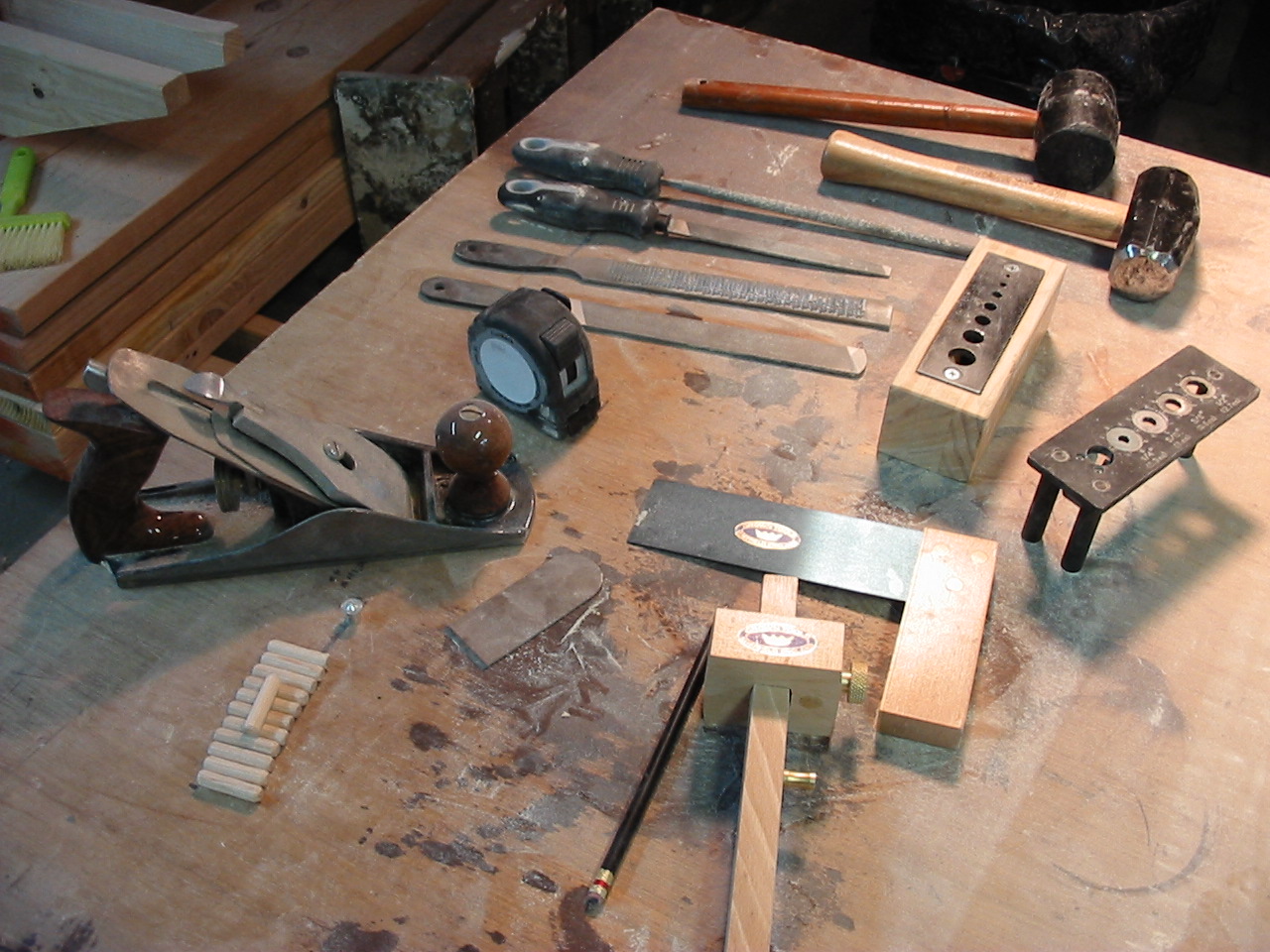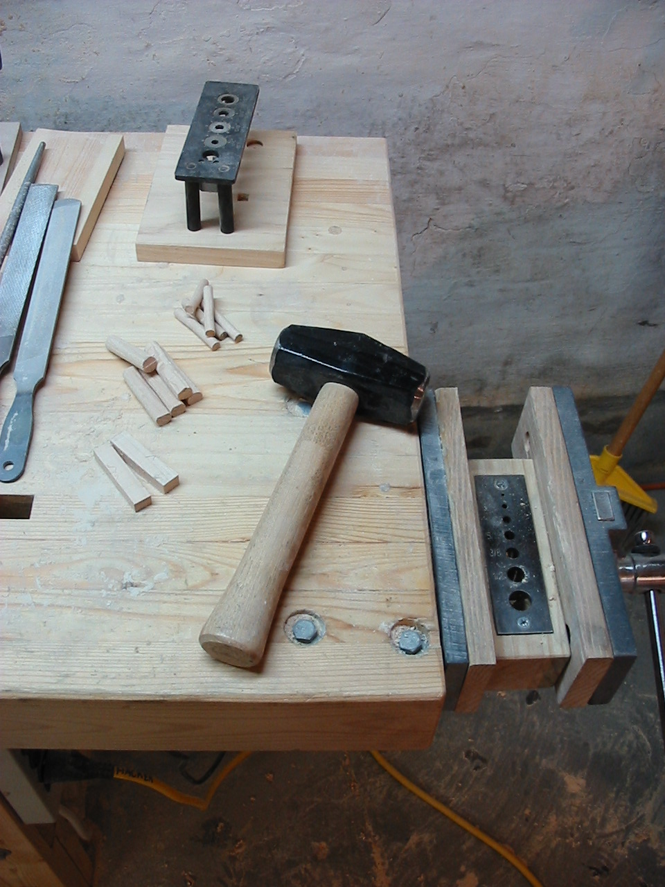 Creating dowels was a challenge, and they can be made a few different ways. I planned on using dowels early in my design and purchased a dowel plate and chamfer block from Hartville Tool, and i am very happy with the results. Pounding out the blanks was a little tough, but with a few tips from the recent Woodwright show i was able to create some very straight and useful dowel pins!