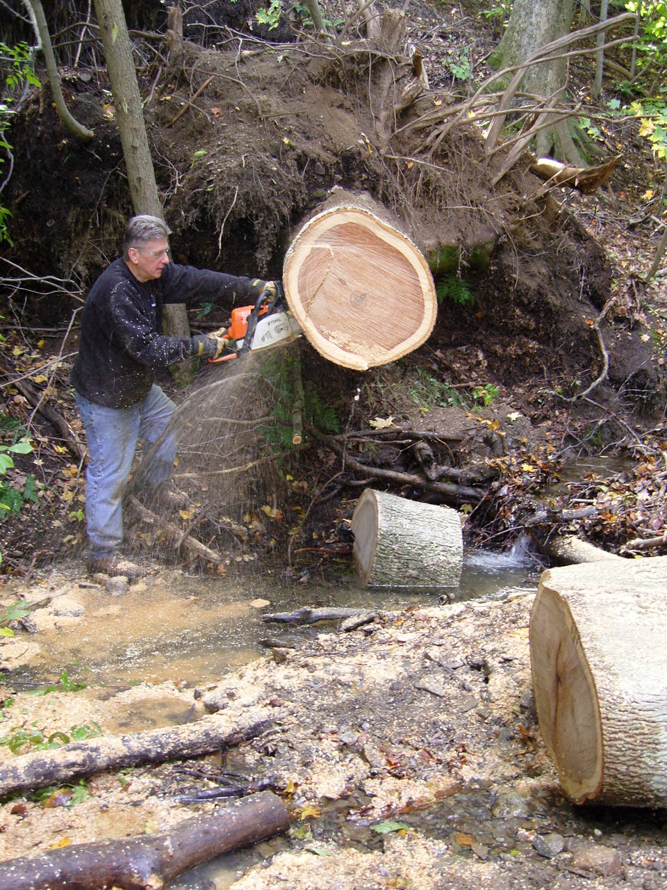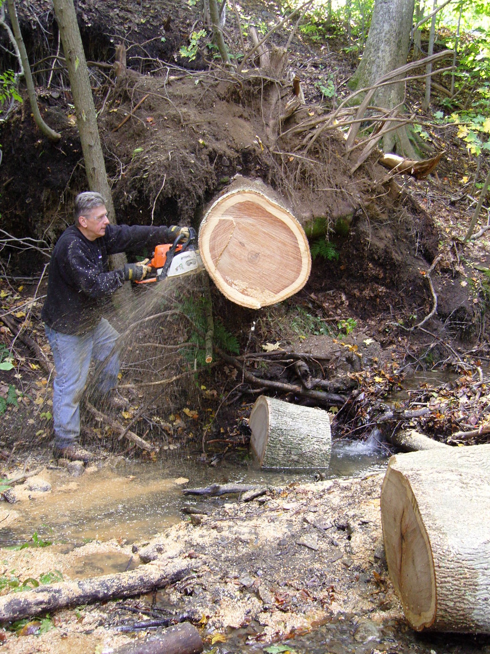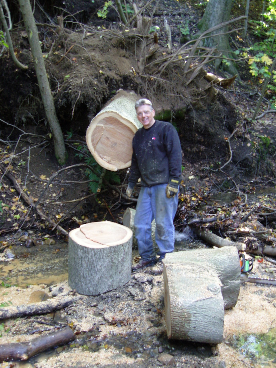 lumber cutting with dad the last big weather system downed this beauty, and all without a sound! it measured approximately 190 feet tall, and 30 inches at its widest spot! this was a GRAND Ole Hickory tree, the old man proclaimed "it will destroy my blades..", i had only asked for eight or so feet milled! it fell right into the road and required removal which was completed in one weekend, almost! the lower section was very dificult to remove out of the lower gully. all sections were rolled out manually, uphill, and loaded on a trailer for removal leaving little impact on the area, save some foot prints and saw chips. this Hickory tree will mostly be used for firewood, and we saved a few choice sections to have milled down for some lumber! notice the template stick in the one photo, that ensures all sections are the same width for greater stacking and spliting firewood registration. an amazing trait of hickory: its one of the only woods who retains the outer bark once dry! can't wait to see what will become of that lumber, the outter edge is beautiful!