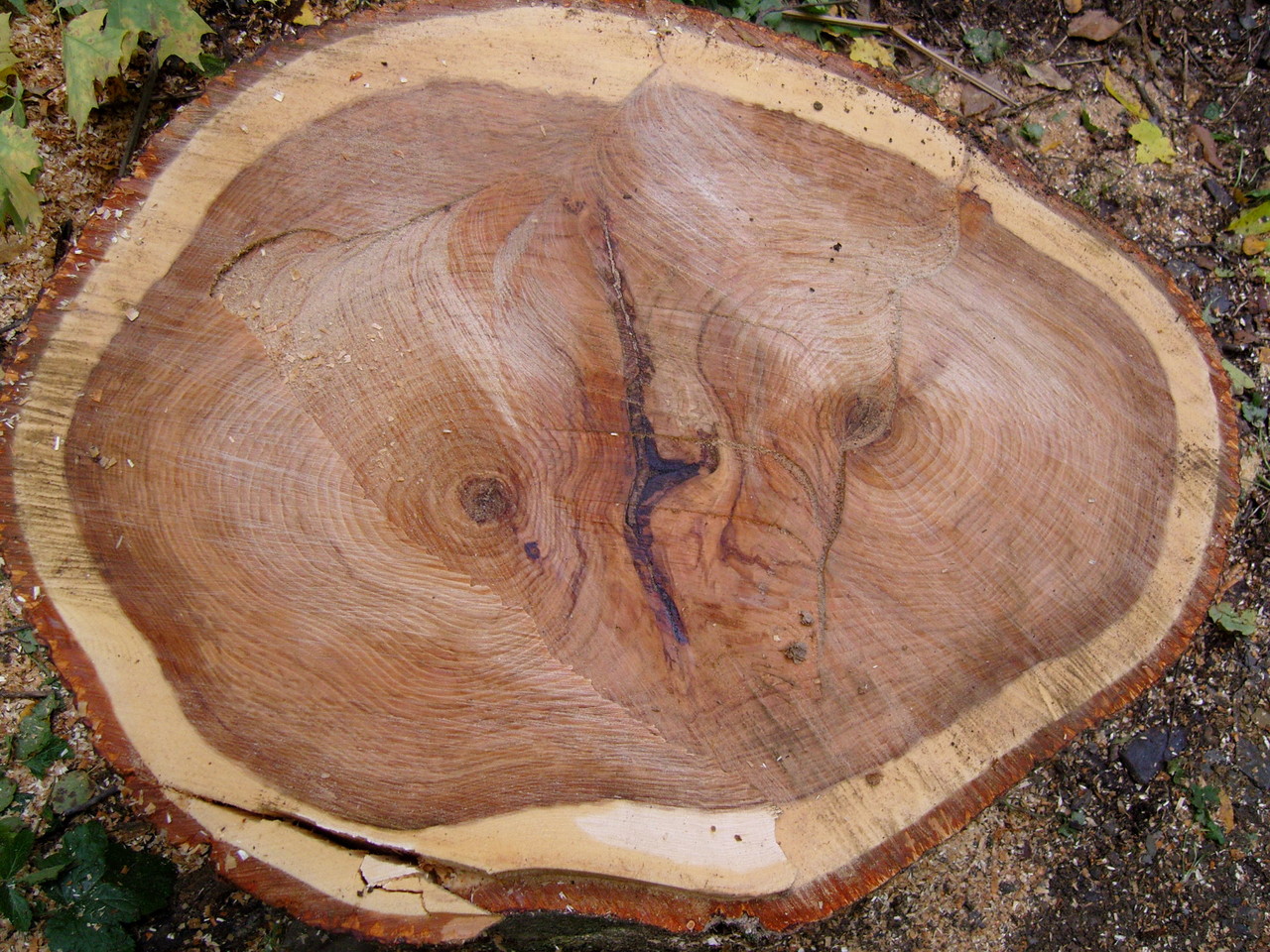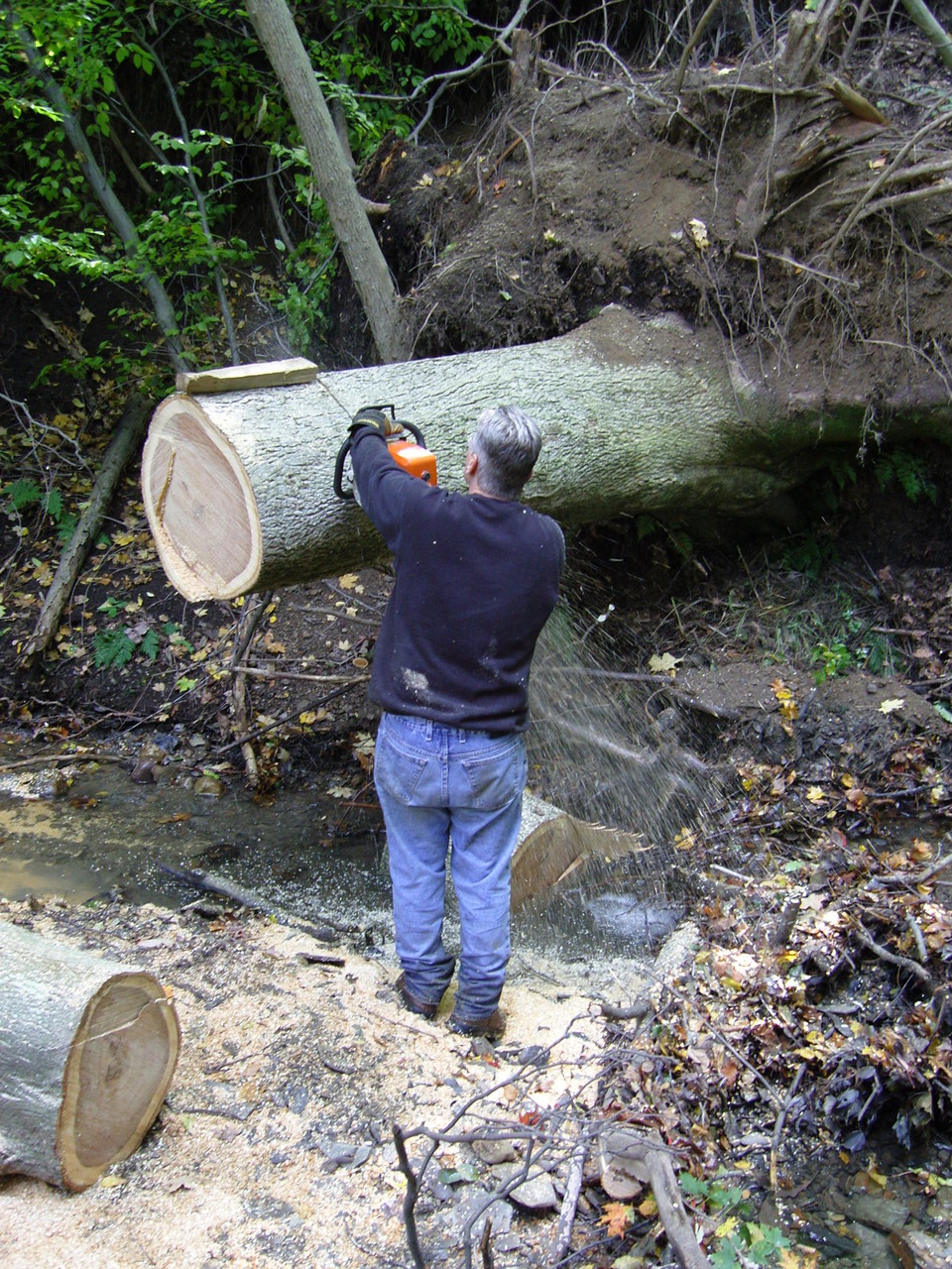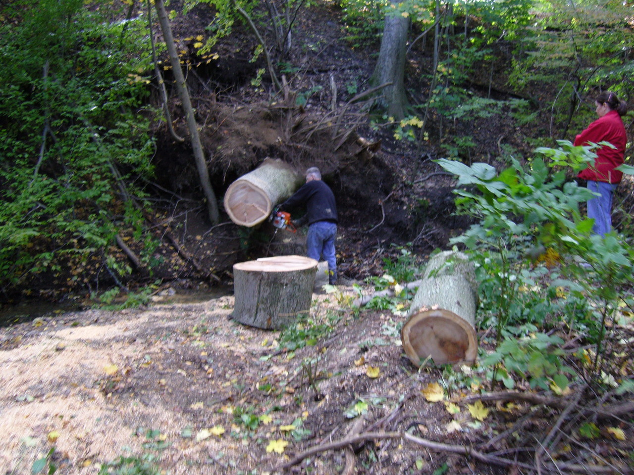 lumber cutting with dad the last big weather system downed this beauty, and all without a sound! it measured approximately 190 feet tall, and 30 inches at its widest spot! this was a GRAND Ole Hickory tree, the old man proclaimed "it will destroy my blades..", i had only asked for eight or so feet milled! it fell right into the road and required removal which was completed in one weekend, almost! the lower section was very dificult to remove out of the lower gully. all sections were rolled out manually, uphill, and loaded on a trailer for removal leaving little impact on the area, save some foot prints and saw chips. this Hickory tree will mostly be used for firewood, and we saved a few choice sections to have milled down for some lumber! notice the template stick in the one photo, that ensures all sections are the same width for greater stacking and spliting firewood registration. an amazing trait of hickory: its one of the only woods who retains the outer bark once dry! can't wait to see what will become of that lumber, the outter edge is beautiful!
