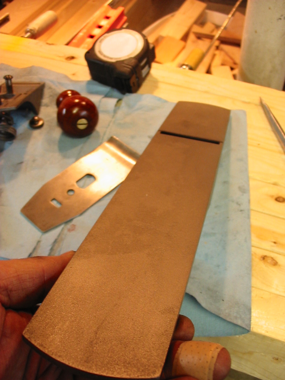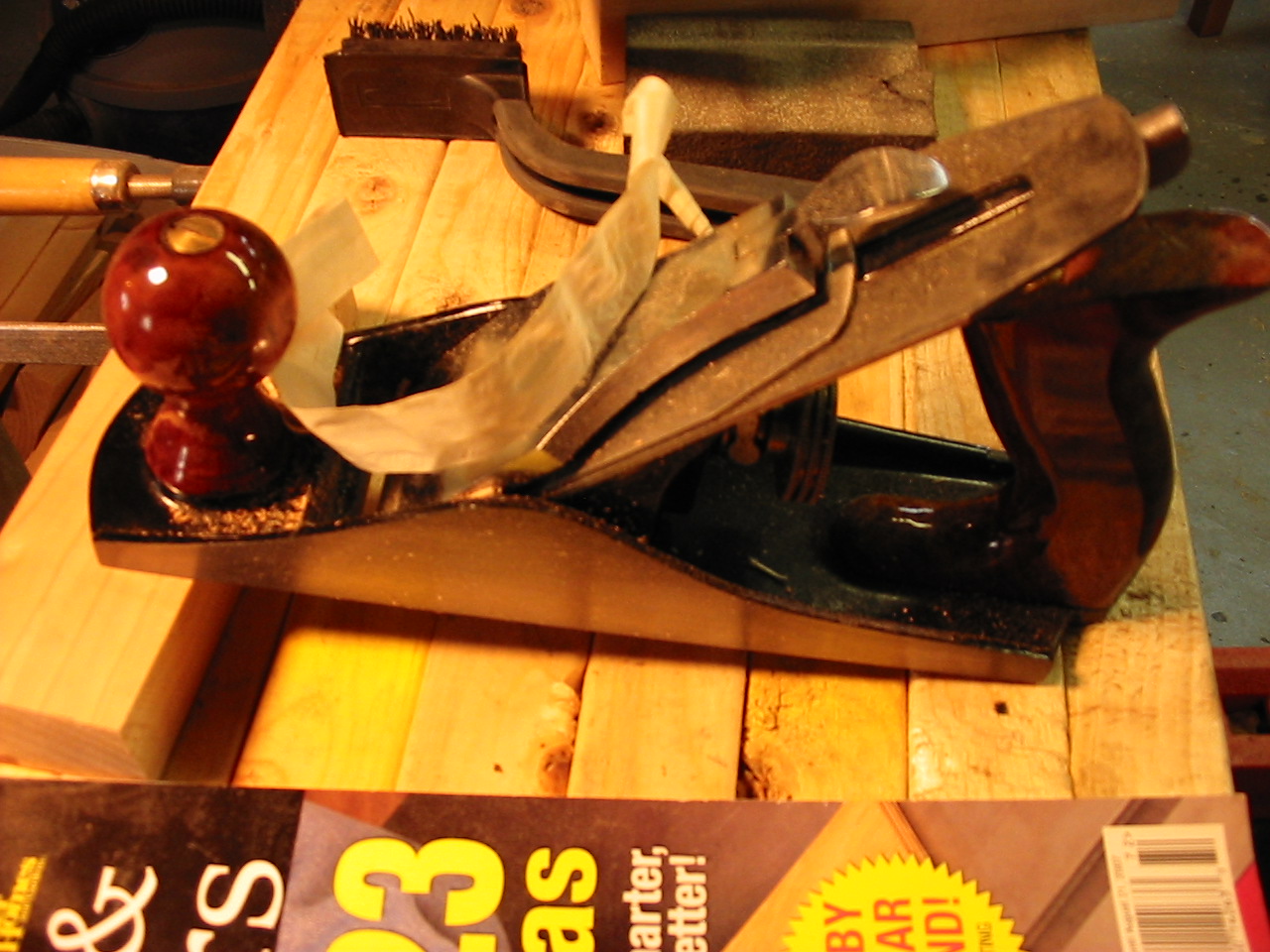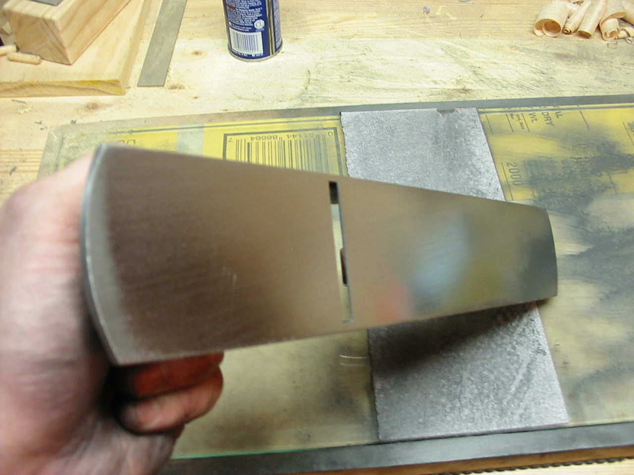 Hand Plane Tune-Up I now have a small collection of 4 planes, which consist of two bench planes one from China (Harbor Freight) and one from India(Hartville Tool). The block plane came from China (Home Depot) and without knowing the true origins of my 14" Jack Plane i will guess it was made in the USA. Now i have spent a considerable ammount (6-7 5hr days) of time working each of these tools on my sanding paper(3M & Norton), and float glass and have a few interesting things to report, namely WOW I HAD NO IDEA.... With just a little while (30min) on each 110 and 220 grit paper the difference in sole flatness is amazing! You will want to keep going, and will be amazed how far you can clean up all of these 'useless' tools making each sole nearly perfectly flat! The steel for the blades is an interesting topic, and clearly a properly honed Hock blade in the old 14" jack was the show stopper, yet the 'cheap' steel performed well, once honed! The China steel was the dirtiest, hardest, and stayed sharp long on my redwood test block. The India steel was clean and less difficult to draw across the sand paper, but didn't stay as sharp as long as the China steel. Of Note, the most untrue plane sole was the made in USA old 14" jack plane, with a couple casting blemishes, but these all disappeared in time, and there was only a small section of this sole that i didn't true, it can be seen in the first of those mirror images. So the lesson to be learned is this: You _can_ buy a cheap plane and make it work well, but ONLY if you invest the time in properly tuning the tool!