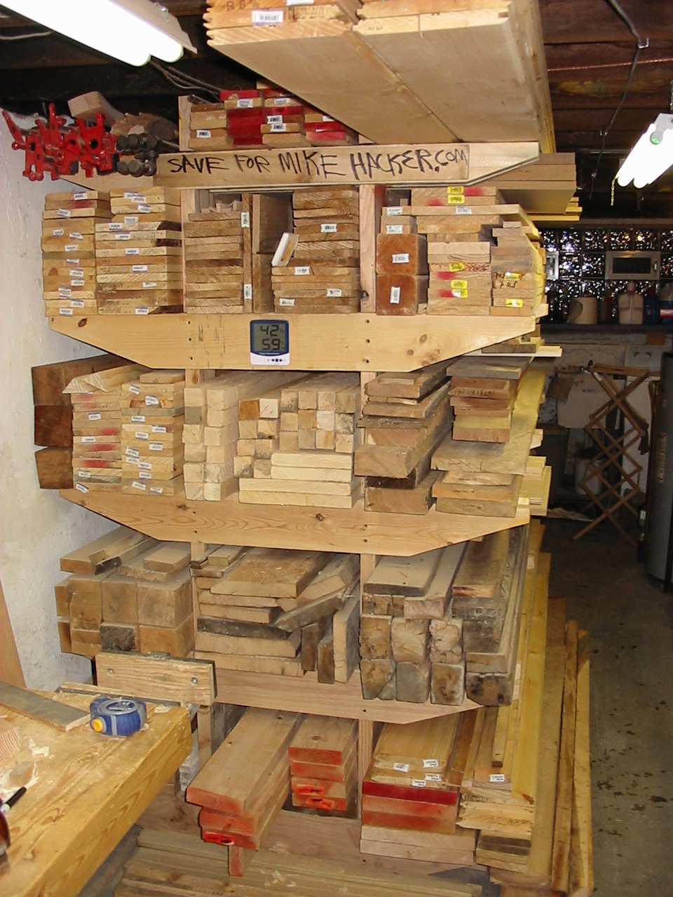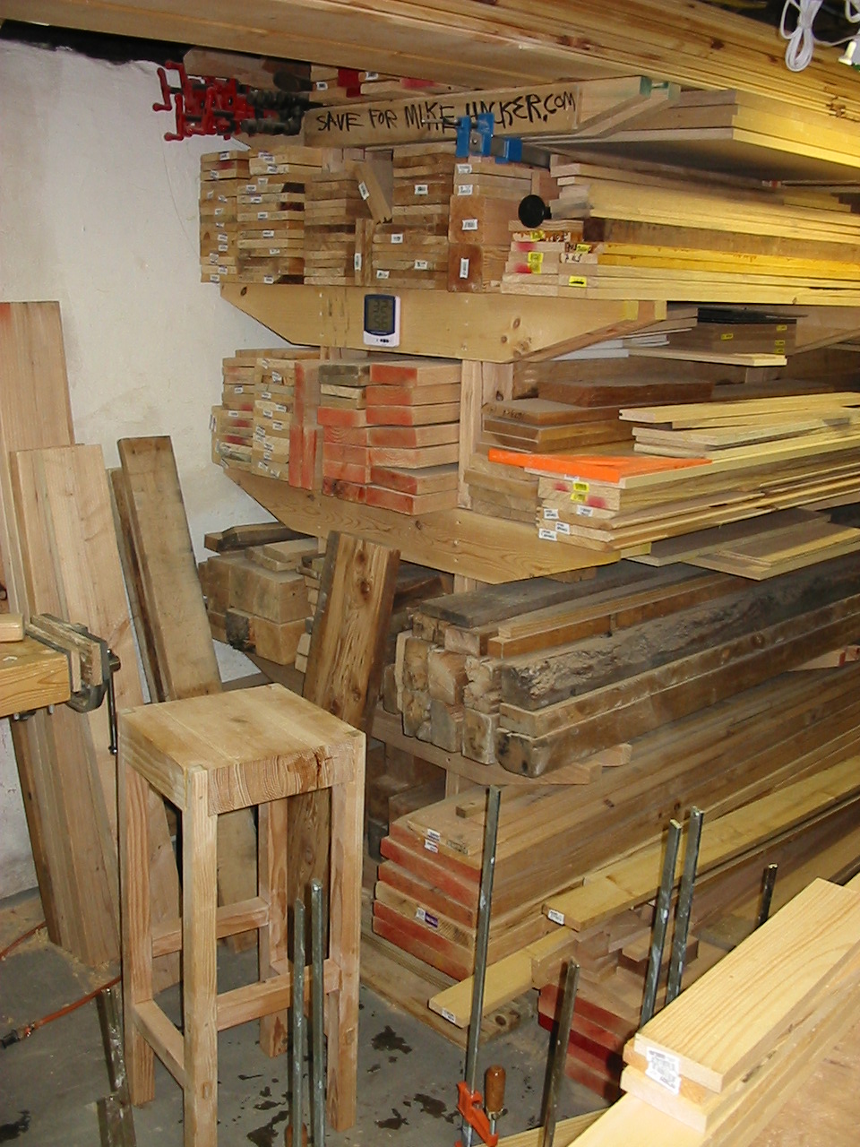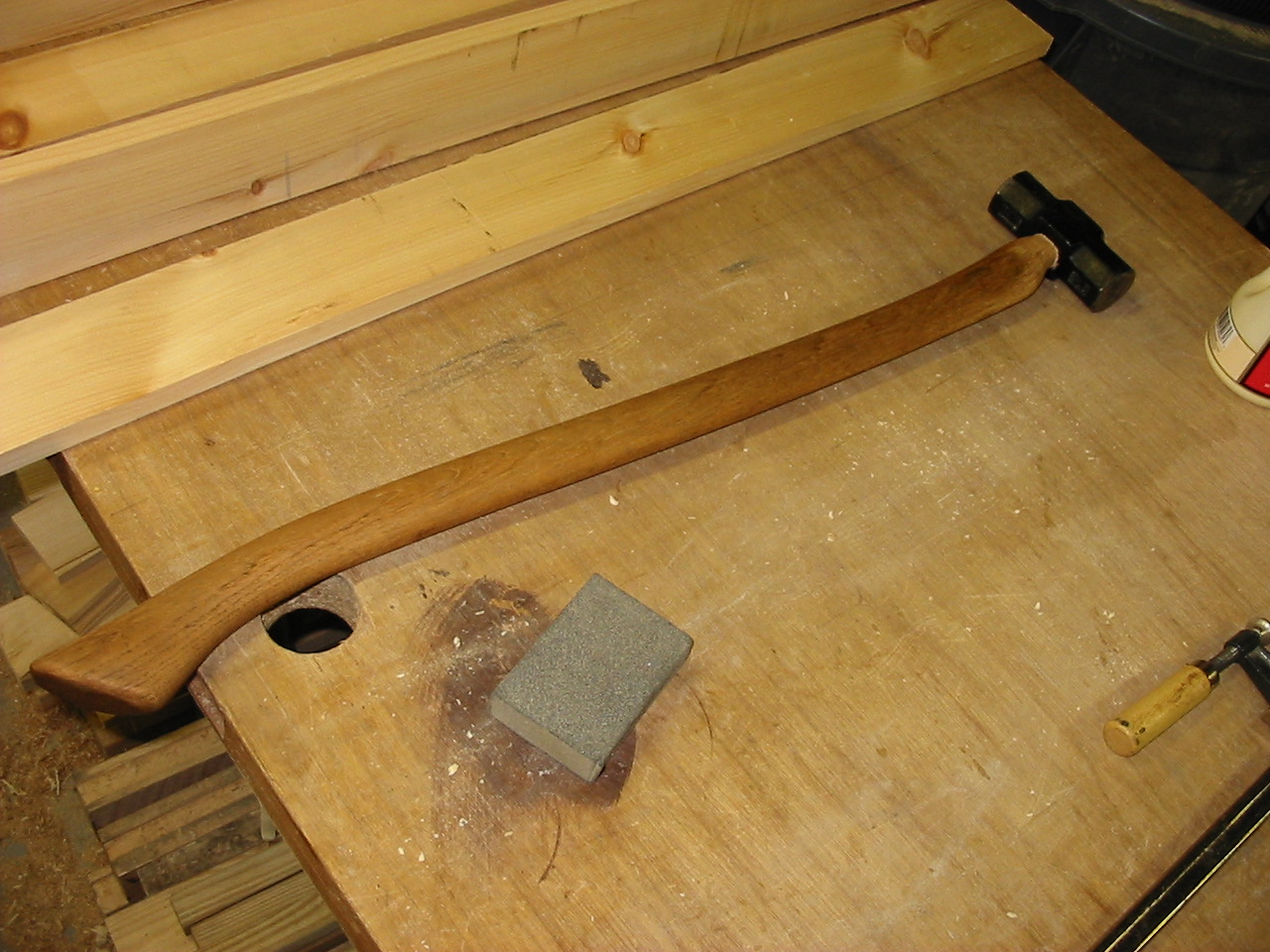 Lumber Rack Updates its been over a year since i packed out my rack, and i have been using much of the lumber i have been collecting. many of the air dried pieces are reaching acceptable moisture levels, and remaining straight and looking good! i recently took a trip to my Amish lumber friends and scrounged up some really awesome lumber. i have been itching to make a set of hollows and round moulding planes, and with the recent win of some cool tool steel, i need to get some lumber drying to make the plane bodies. originally i wanted to get some fruitwood, particularly apple wood to make my plane bodies. my reasons are simple, tools made from apple wood are often rare, extremely wear resistant, and living in New York we have an abundance of this beautiful wood. unfortunately my friend didn't have any apple wood at this time, he's looking for next year! i did happen to find some very amazing Hickory with very straight grain and great color. it was downed in Feb. of 2008 and will sit for another nine or so months until it will be ready to begin the plane making process. i also got some great Ash for the faces of my planes, because it offers great contrasting color, and superior wear characteristics. the rack has really packed itself out, and is working very well for my needs. its about all the lumber i can justify without being called crazy! i also trew together a pallet smashing hammer! its a 3lb head on an old hickory axe handle and is surprisingly well balanced. its perfectly light for one handed use, and powerful enough to break pesky pallet joinery. its a great homemade tool!